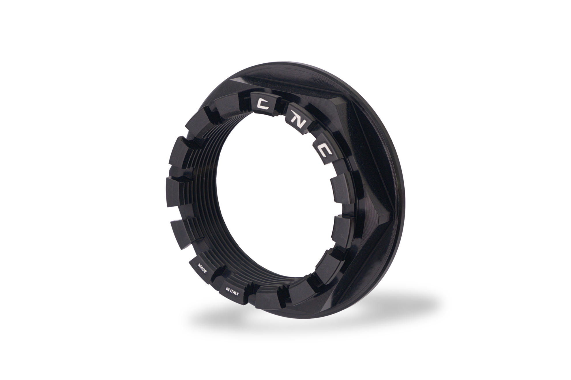Dado ruota posteriore lato destro lavorato dal pieno in lega leggera con successiva anodizzazione superficiale.