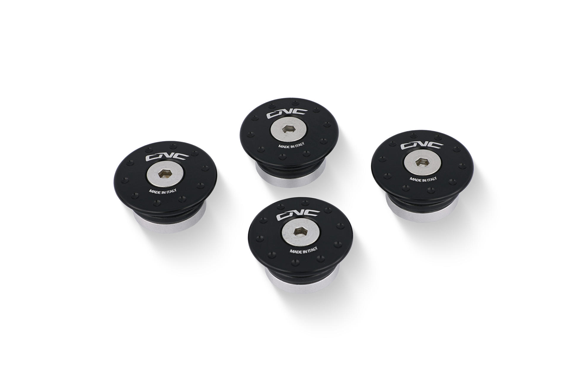 Tappi telaio realizzati dal pieno in lega leggera con successiva anodizzazione superficiale. Il kit è composto da 4 tappi ognuno nelle misure precise per adattarsi ai vari fori del telaio.