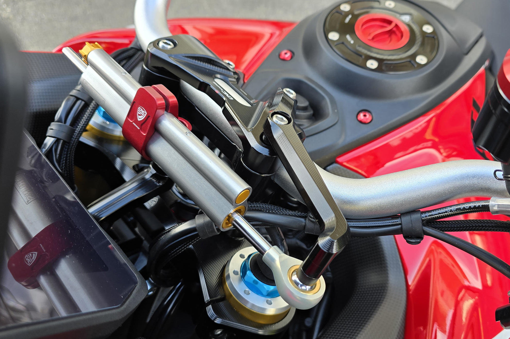 Kit ammortizzatore di sterzo per Ducati Multistrada V4 realizzato dal pieno in lega leggera con successiva anodizzazione superficiale.
