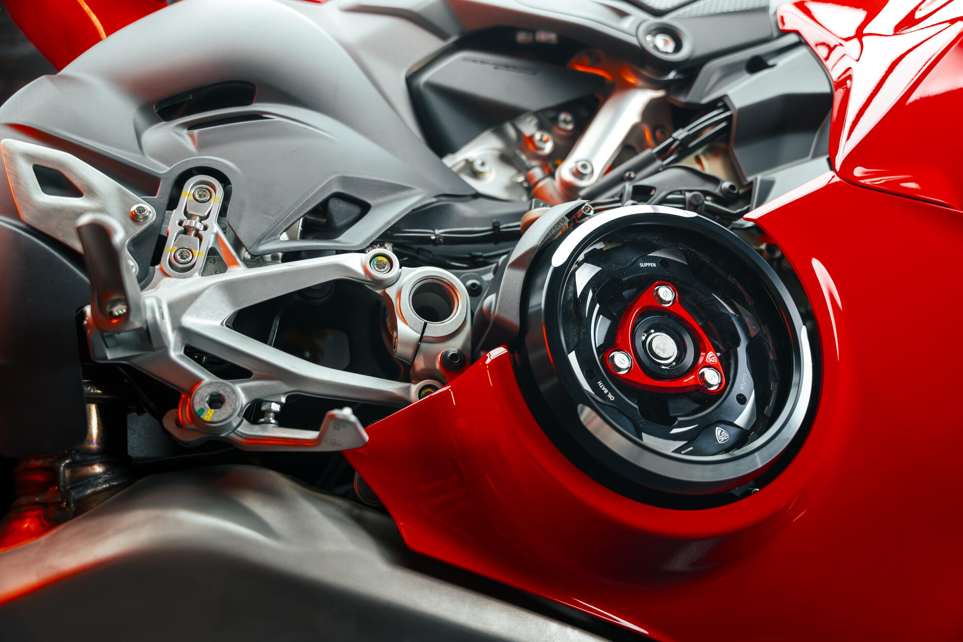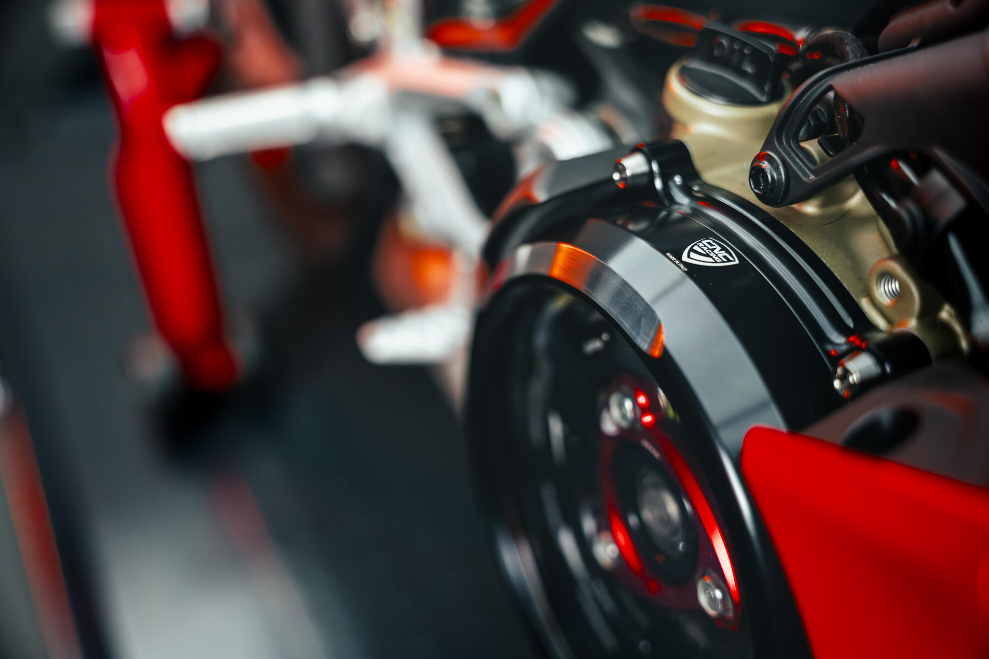 Carter trasparente per frizioni ad olio Ducati Panigale V4, realizzato in alluminio lavorato dal pieno.