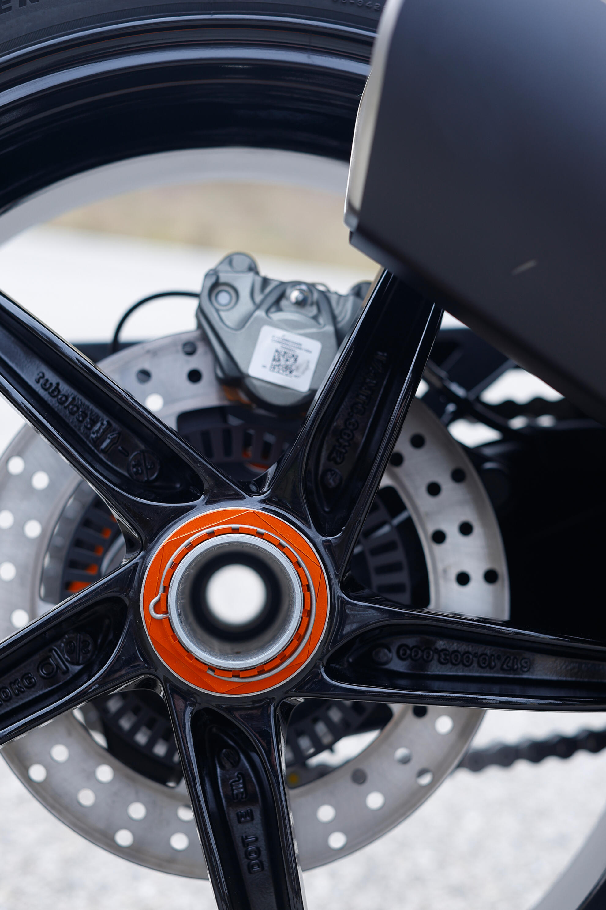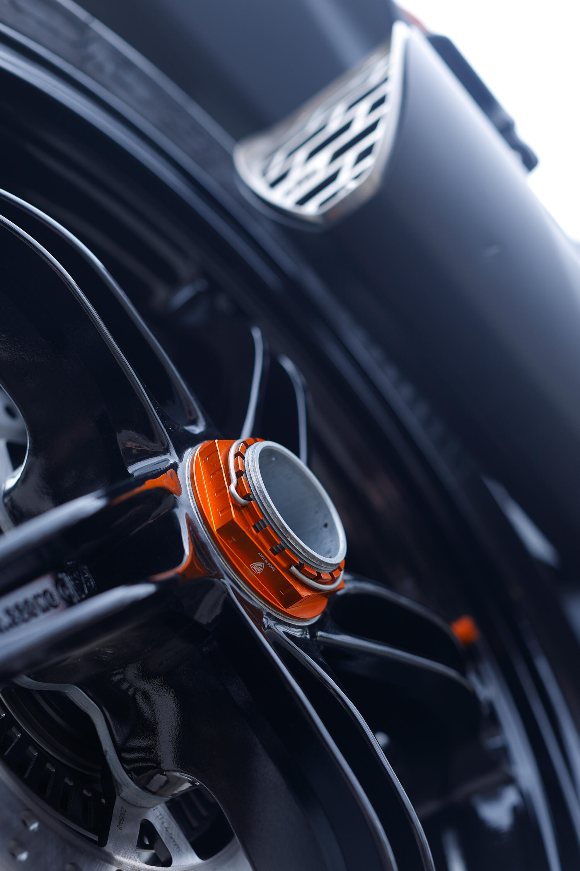 Dado ruota posteriore lato destro lavorato dal pieno in lega leggera con successiva anodizzazione superficiale.
