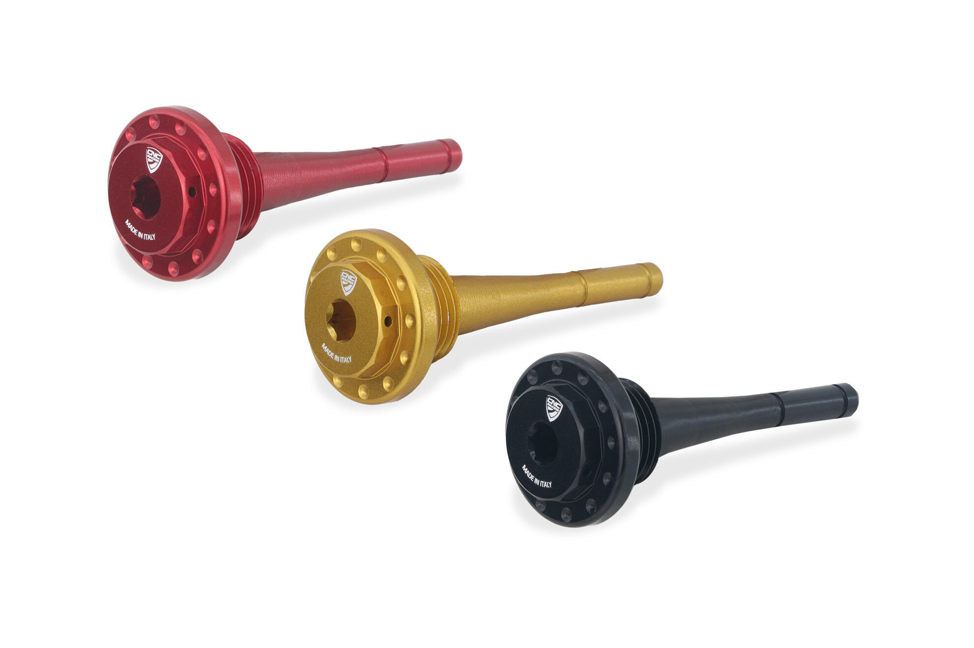 Tappo carico olio motore con asta di misurazione livello olio lavorato dal pieno tramite macchine cnc con successiva anodizzazione superficiale.