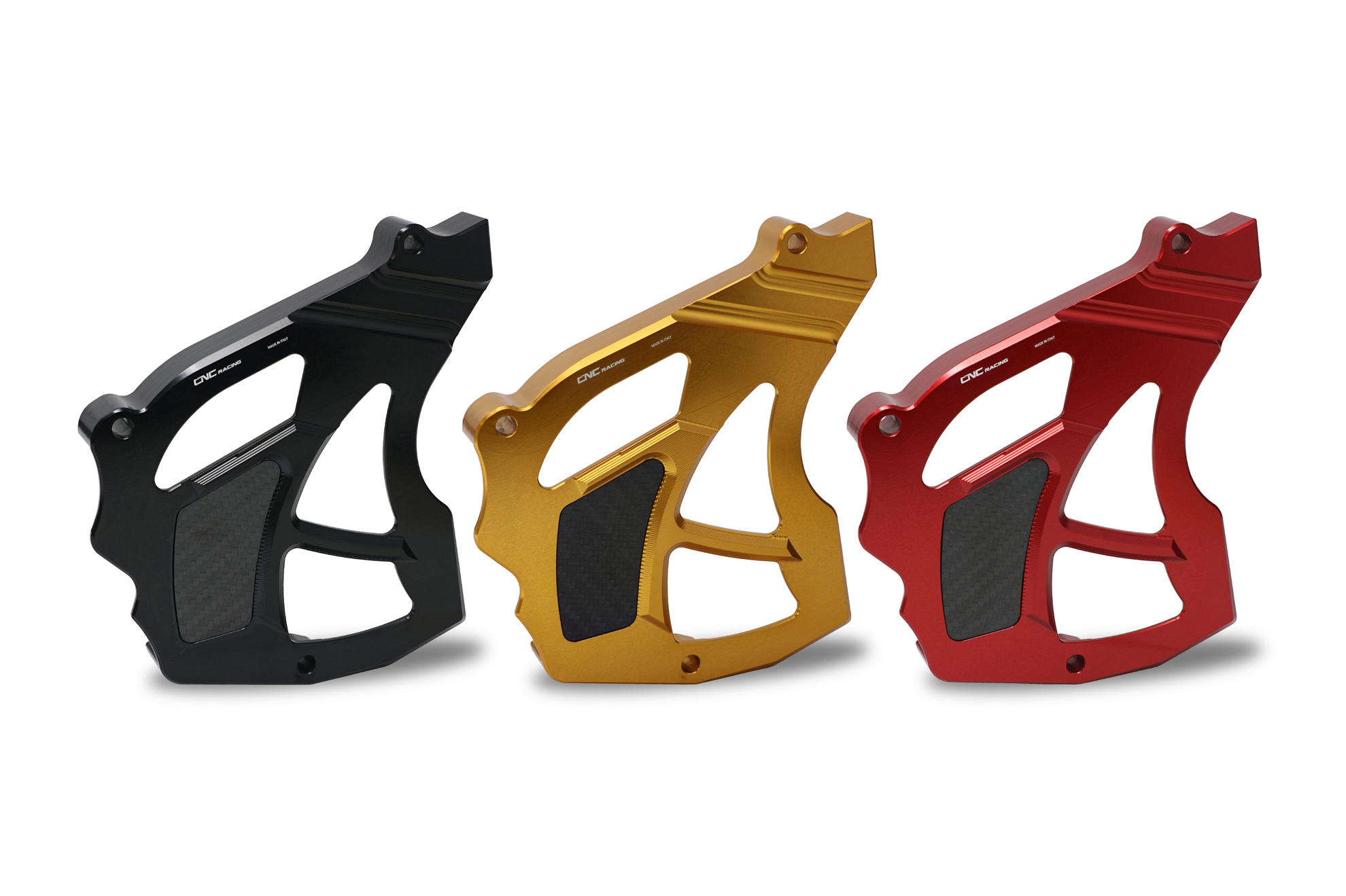 Cover pignone realizzato dal pieno in lega leggera tramite macchine CNC, e successiva anodizzazione superficiale. Sostituisce l'originale in plastica donando un estetica racing e preziosa. Non necessitano modifiche per il montaggio.