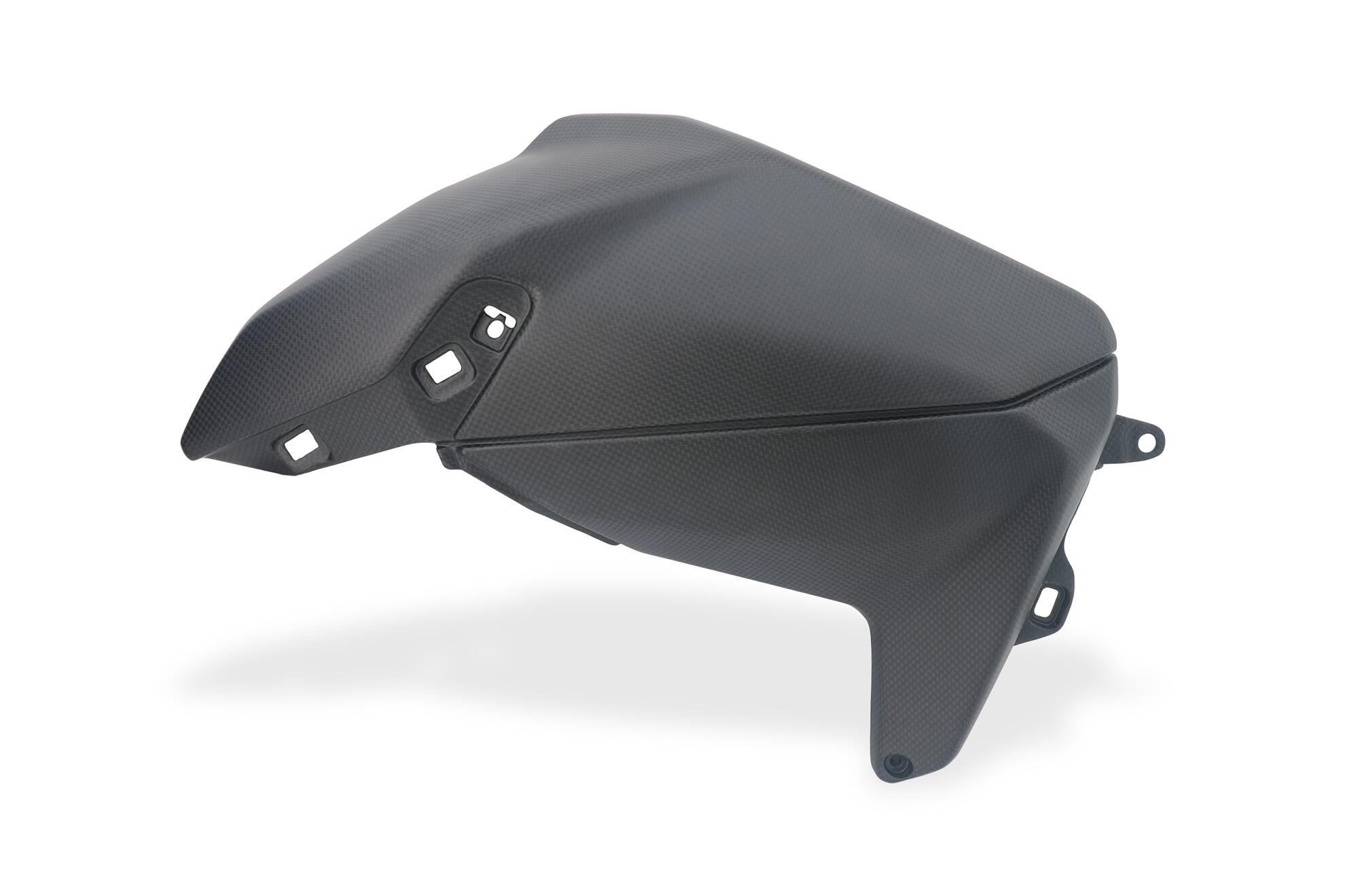 The matte carbon fiber panels visually redefine the fuel tank area, emphasizing the sculpted lines of the Streetfighter V4 and giving the bike a more compact, aggressive, and exclusive appearance. The matte finish reduces reflections and integrates perfectly with other carbon fiber components, creating a cohesive and premium overall look.