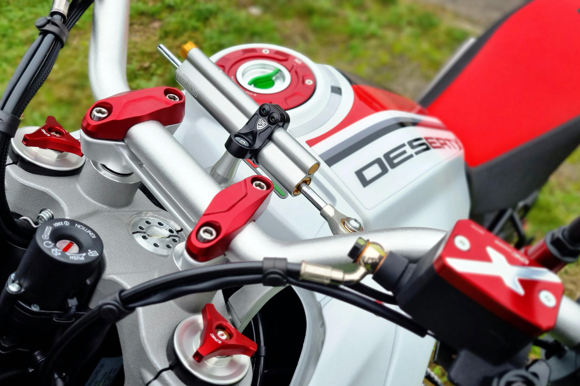 Handlebar upper clamps made of light billet-machined alloy with subsequent surface anodizing treatment.