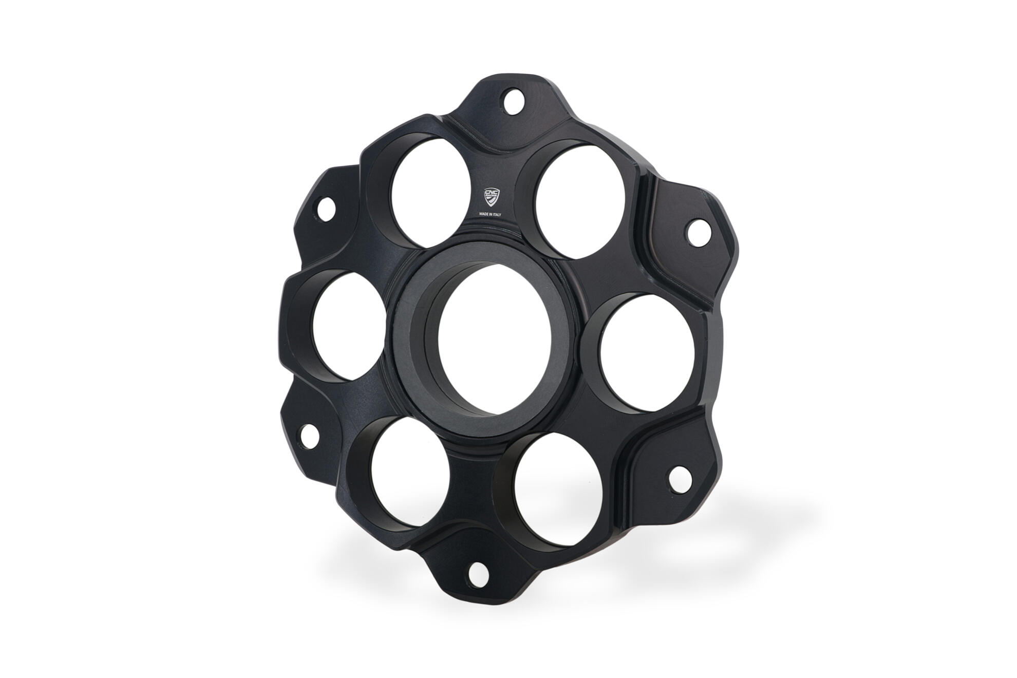 Cush drive hub flange made in light alloy and machined from solid with following surface anodizing.
