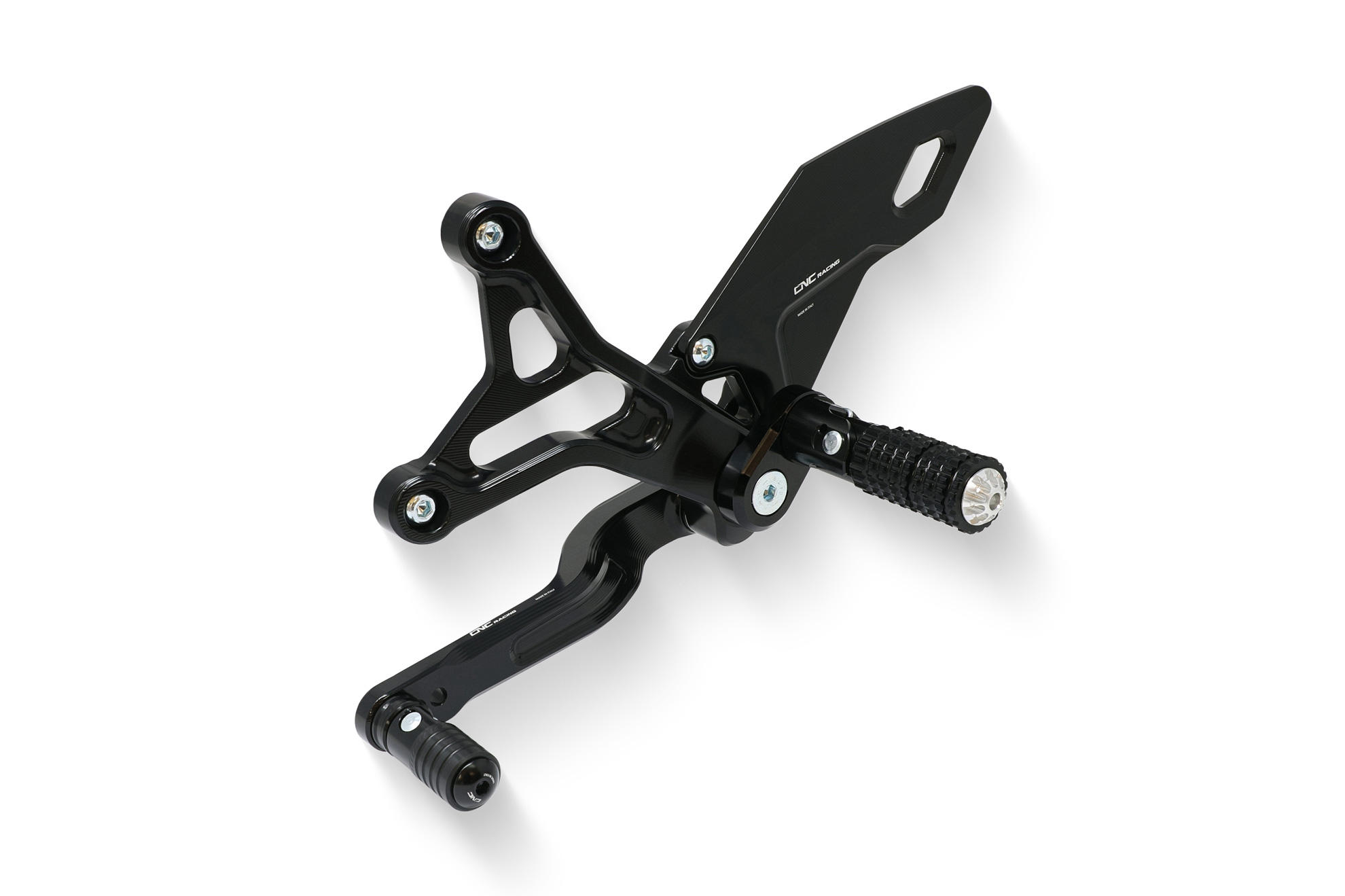 Adjustable rider rearsets made in aluminum machined from billet using CNC machines and subsequent surface anodization.