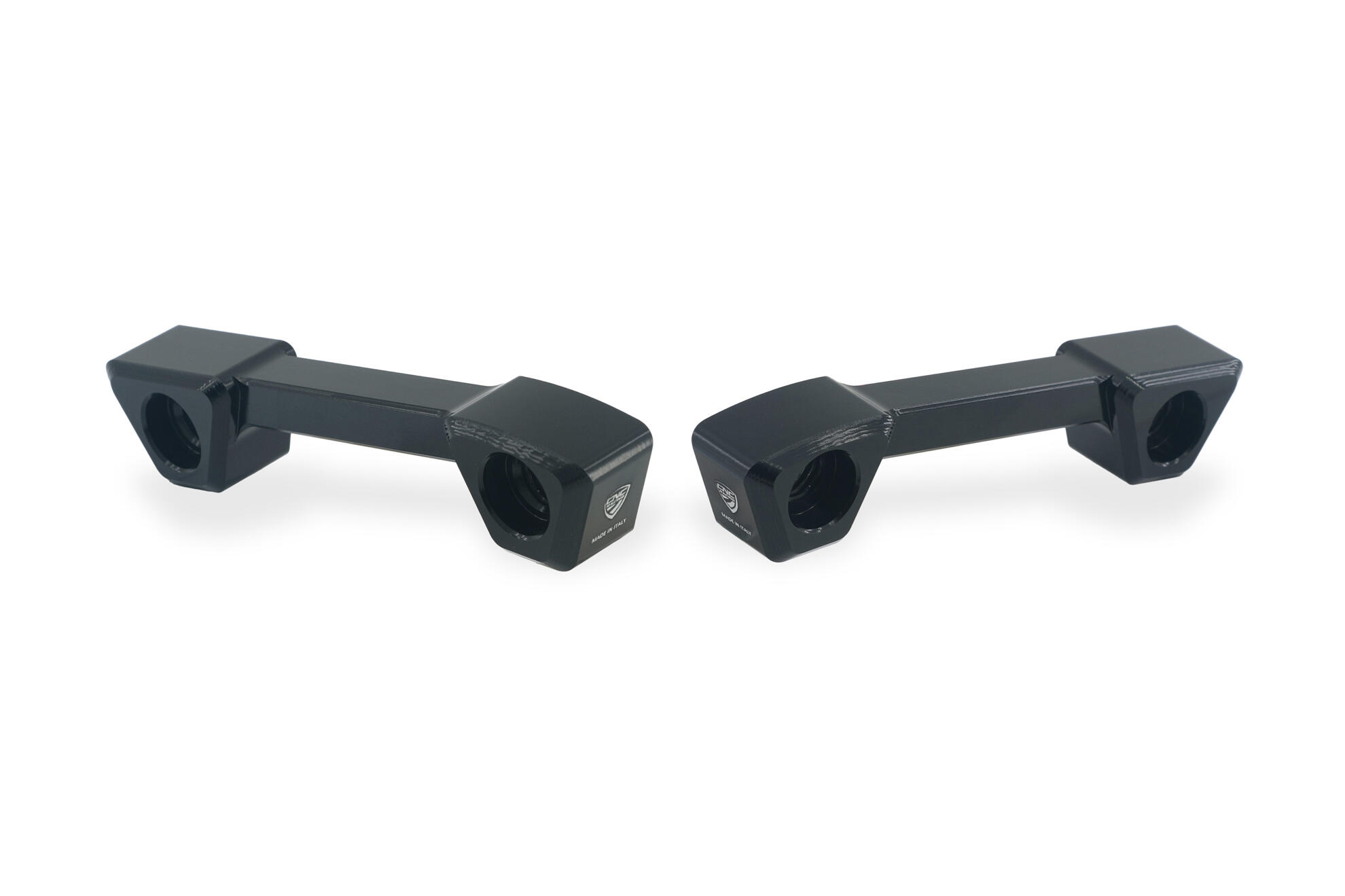 The CNC-machined hole cover plates replace the passenger footpeg brackets and cover the exposed mounting holes, protecting them from water and debris. Their design also provides a secure tie-down point for straps when transporting the motorcycle.