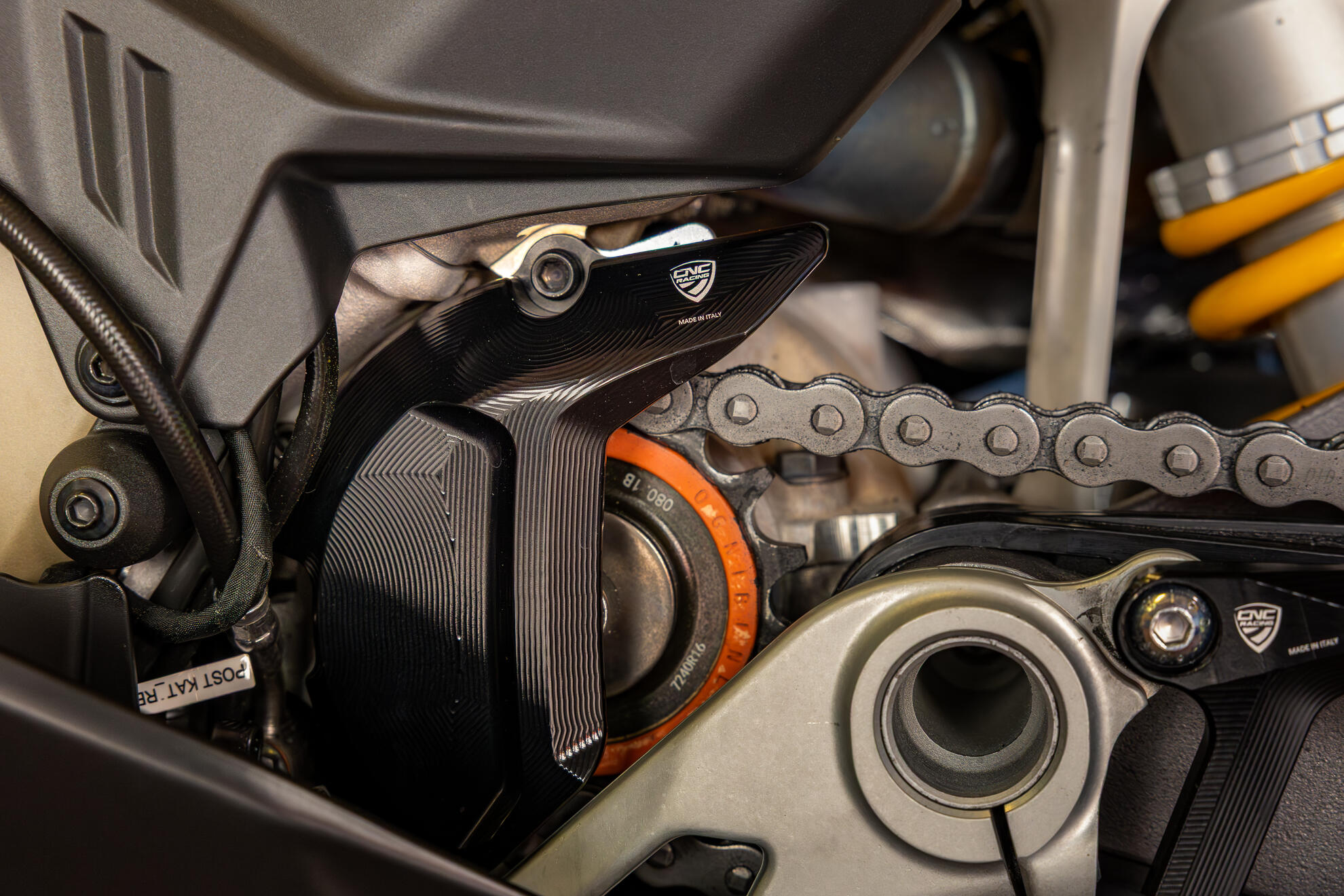 Cover pignone realizzato dal pieno in lega leggera con successivo trattamento di anodizzazione superficiale, sostituisce l' originale senza alcuna modifica.
