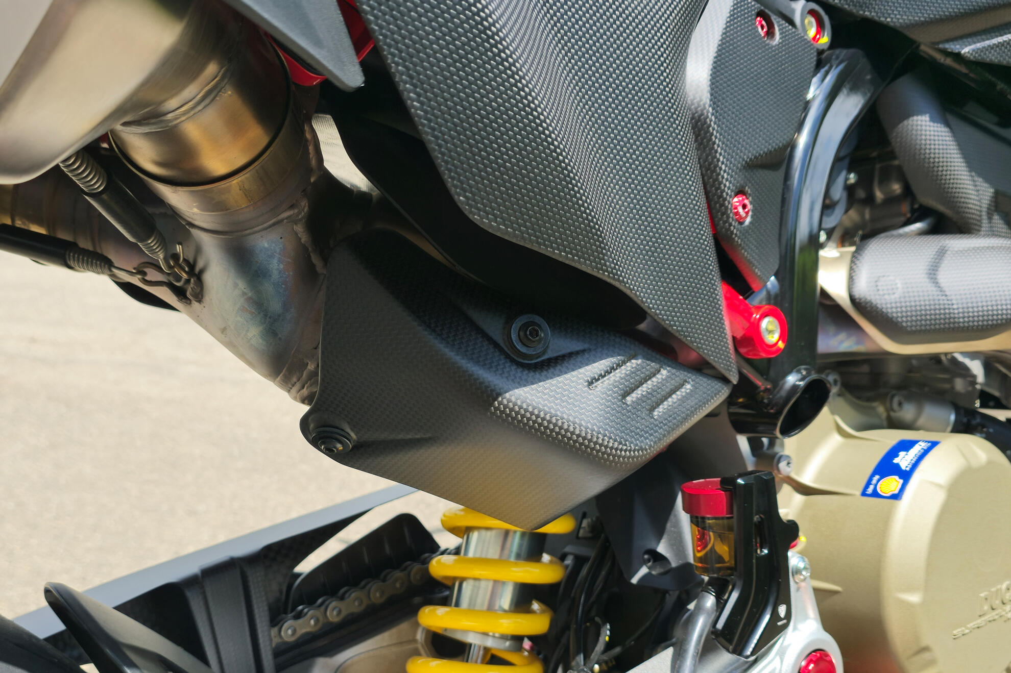 Paracalore posteriore collettori Ducati Hypermotard 698 Mono realizzato in carbonio trama plain con lavorazione in autoclave. All'interno è presente un rivestimento termoriflettente.