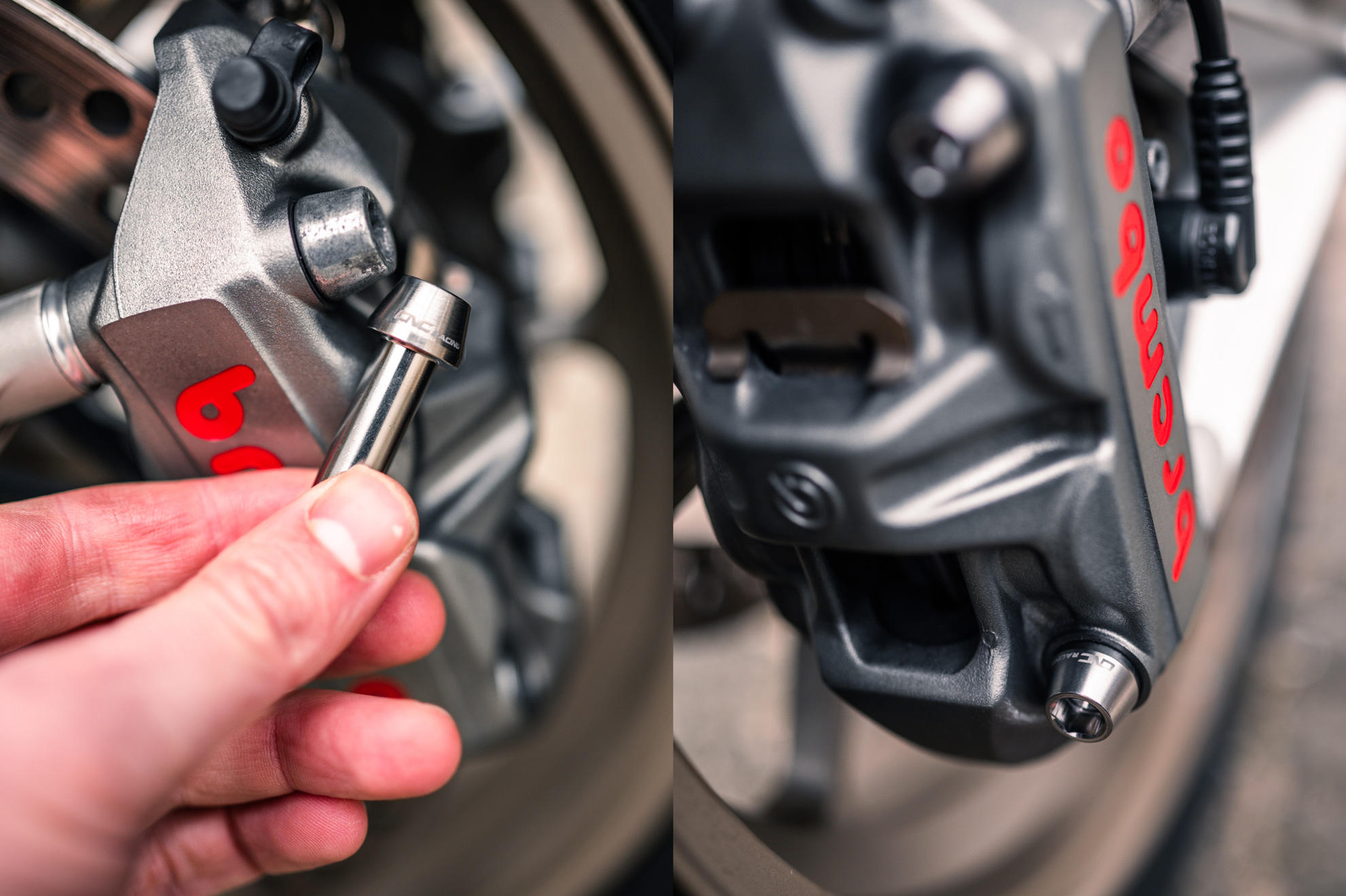 Viteria in titanio per pinza freno anteriore ricavato dal pieno. L'utilizzo di titanio grado 5  permette un notevole risparmio di peso e massima protezione dalla corrosione.