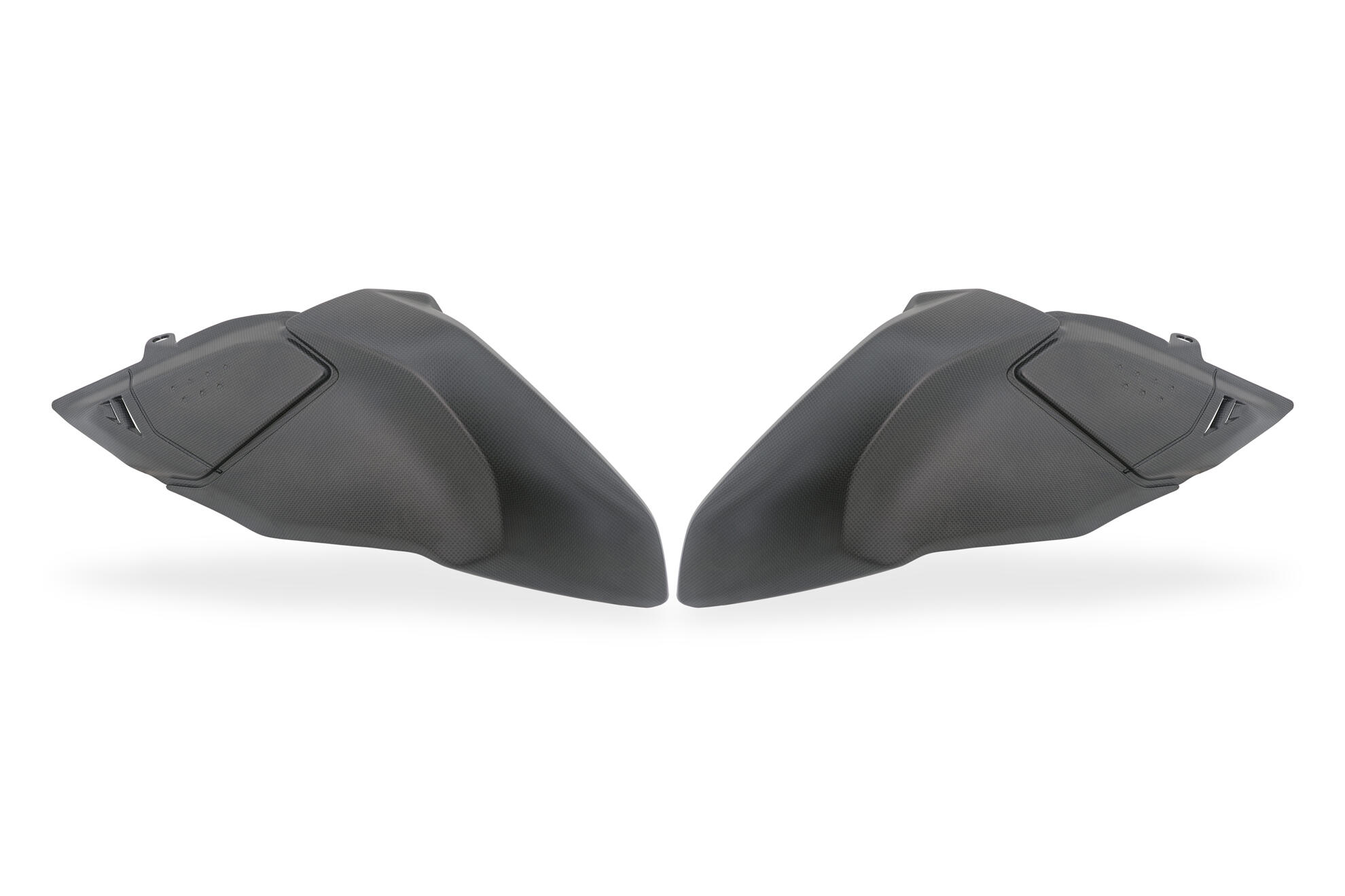 Cover laterali serbatoio carburante, lato destro e sinistro, per Ducati Hypermotard 698 Mono realizzate in carbonio trama plain con lavorazione in autoclave.