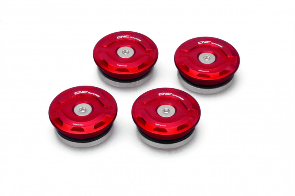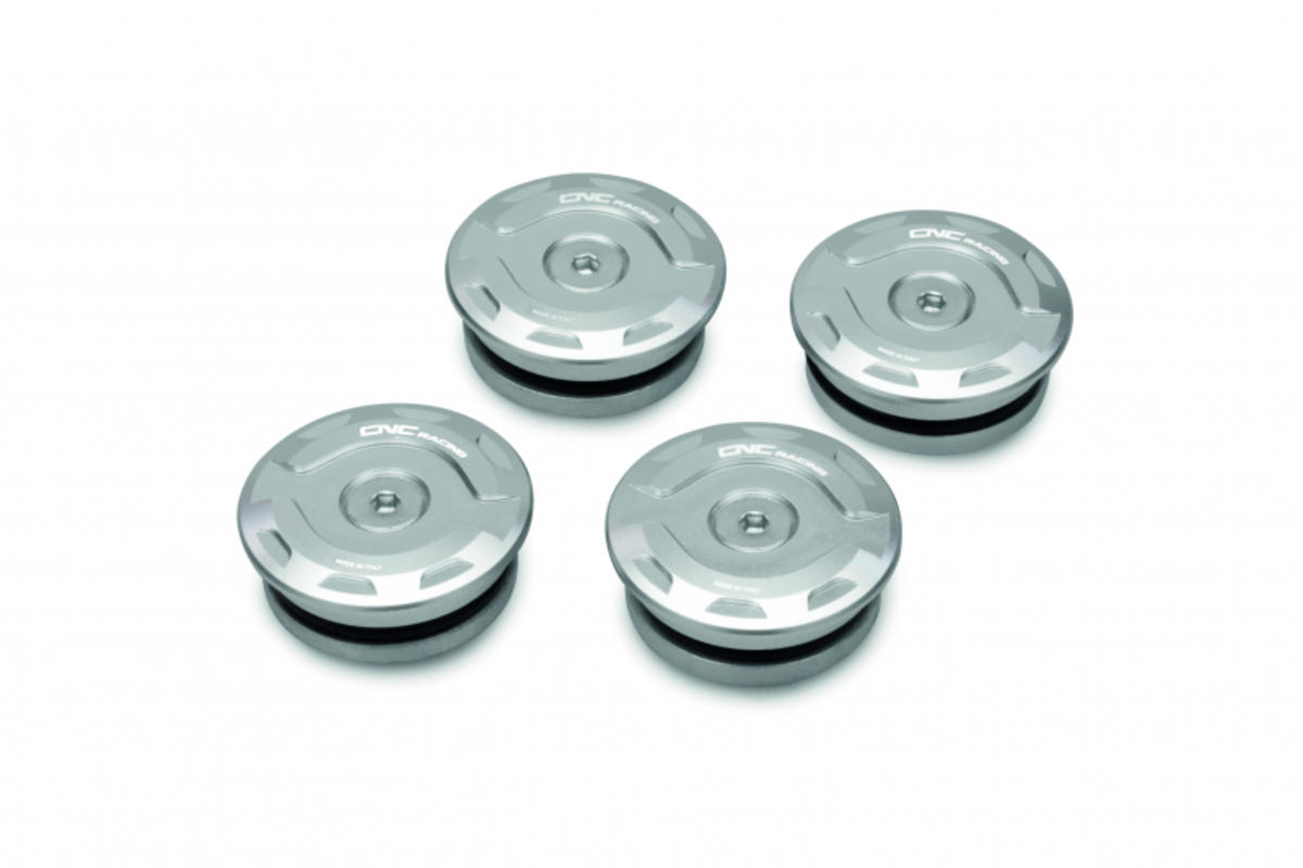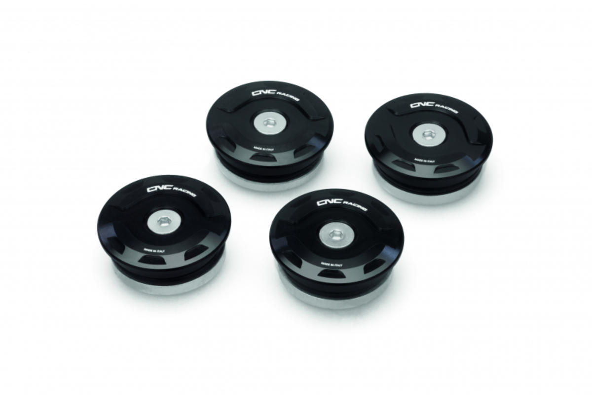 Tappi per le protezioni telaio realizzati dal pieno in lega leggera con successivo trattamento di anodizzazione superficiale.