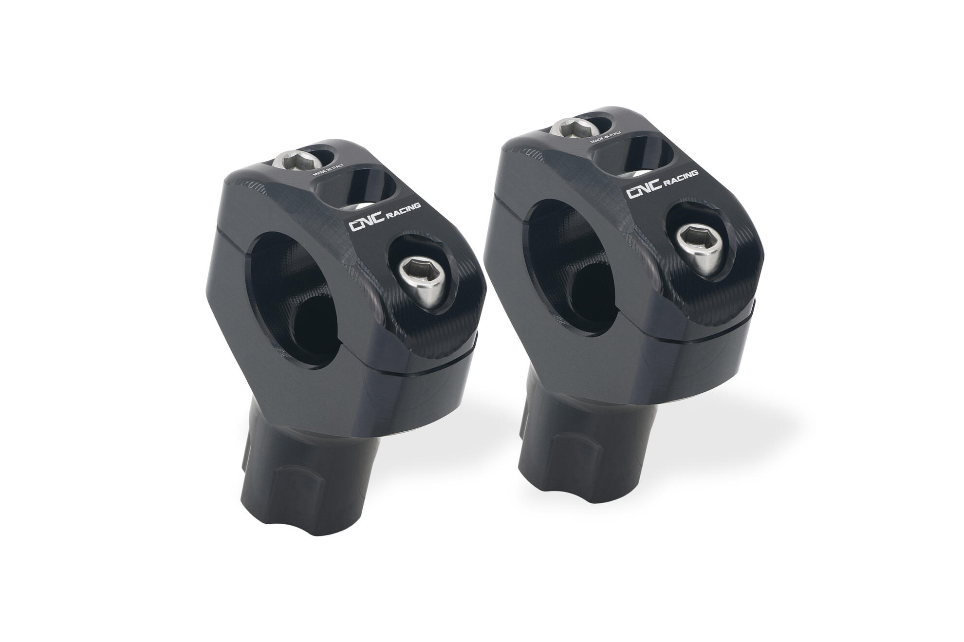 Riser manubrio lavorati dal pieno in lega leggera con successivo trattamento di anodizzazione superficiale. Offrono la possibilità di applicare un manubrio conico sulla moto variando anche l'altezza di guida. Universali perché si applicano su tutti i modelli che hanno la piastra di sterzo superiore con già installato l’attacco per riser la cui vite di montaggio è M10. Kit fornito di viteria per un montaggio semplice e veloce.