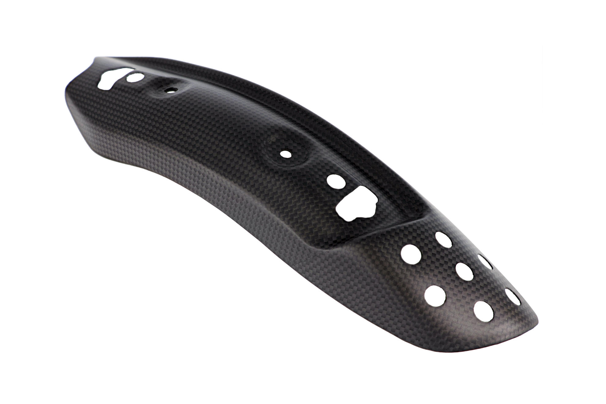 Supporto paracalore collettore in carbonio con trama plain e finitura opaca; prodotto in carbonio 100% lavorato in autoclave, sostituisce senza modifiche l'originale in materiale metallico.