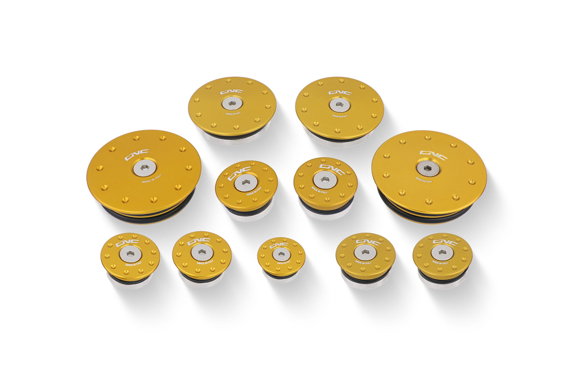 Kit tappi telaio lavorati dal pieno in lega leggera con successivo trattamento di anodizzazione superficiale.
