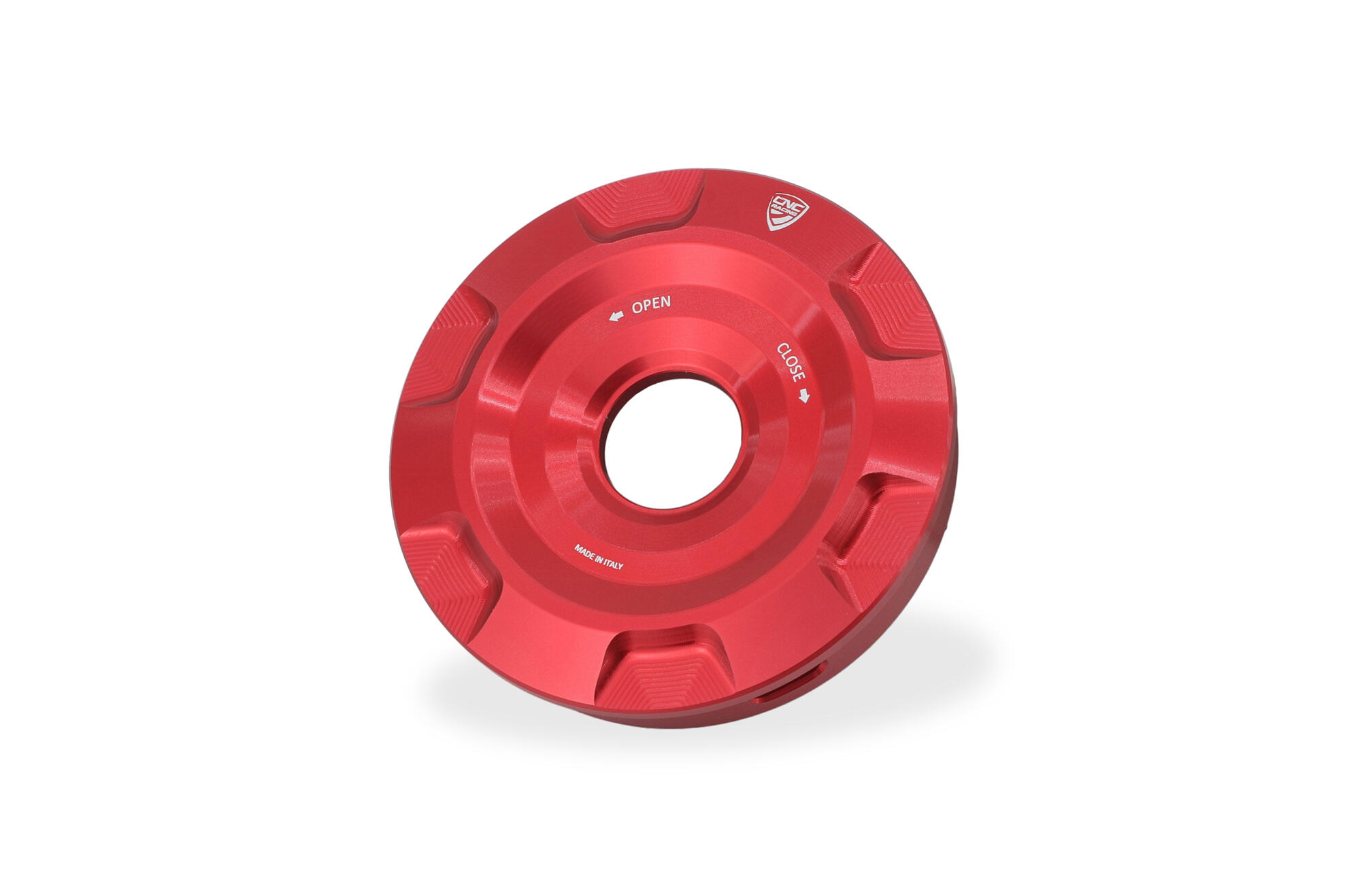 Fuel tank cap made of light alloy, machined from solid and then anodized.